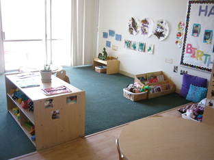 A reading nook at Play House North. The infant classroom at Play House West. The preschool classroom at Play House North, and the toddler classroom at Play House West.